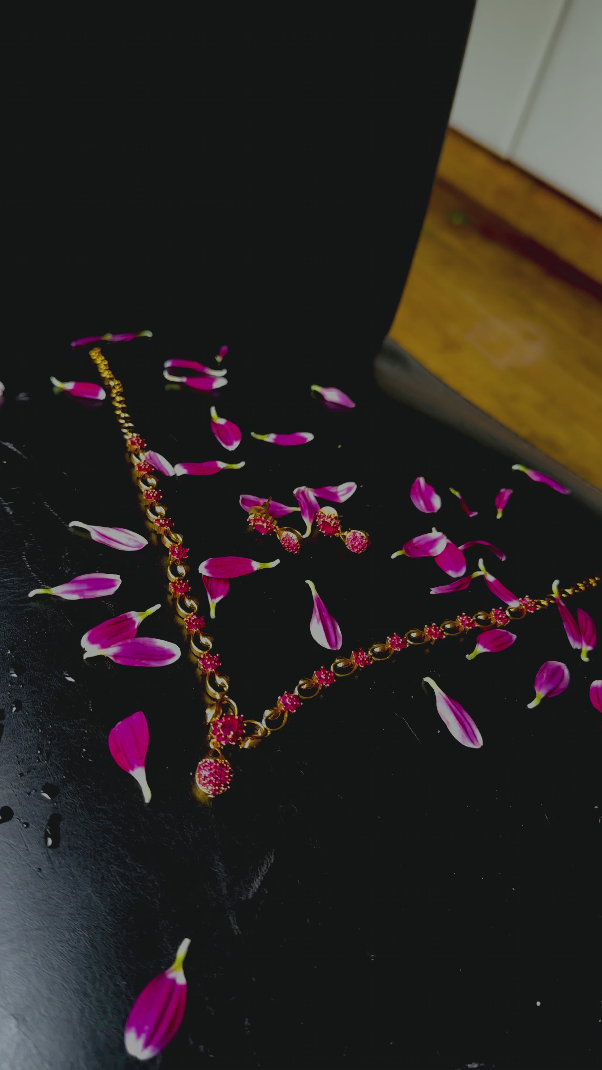 Designed in gold-plated tones and embellished with ruby-colored stones, this piece adds a gentle bloom of color to your style — striking yet effortlessly refined.